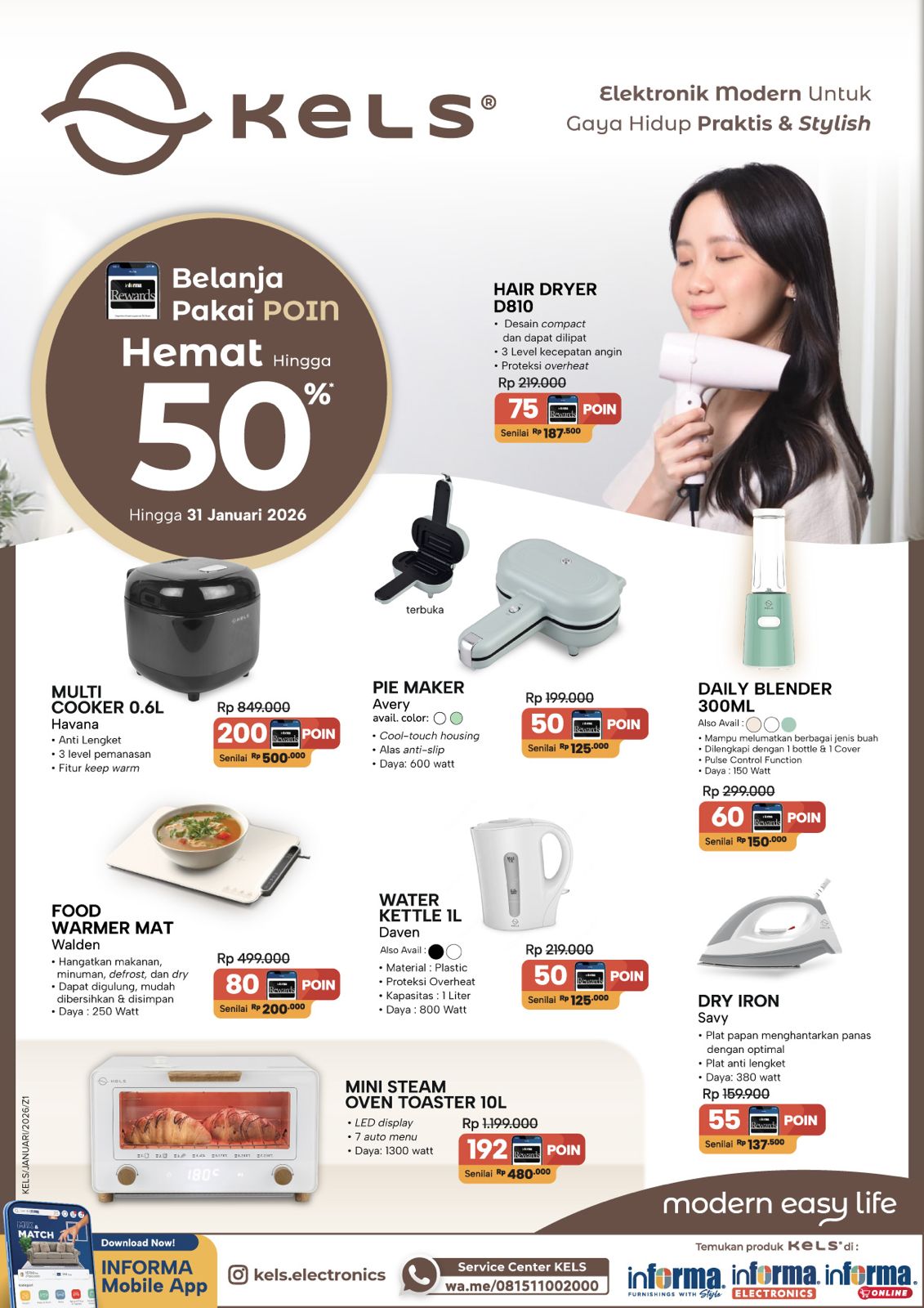 Sepanjang bulan ini, belanja produk elektronik KELS bisa gratis pakai poin Rewards. Dari hair dryer, setrika, sampai alat masak mulai 50 Poin aja.