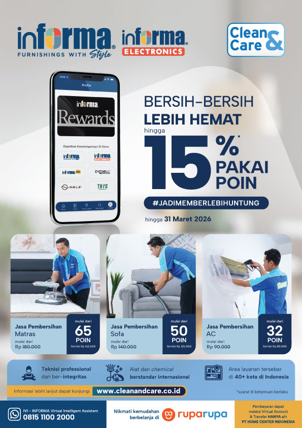 Spesial member INFORMA lebih hemat bayar pakai poin berbagai layanan pembersihan sofa, matras, hingga AC, mulai 32 poin.