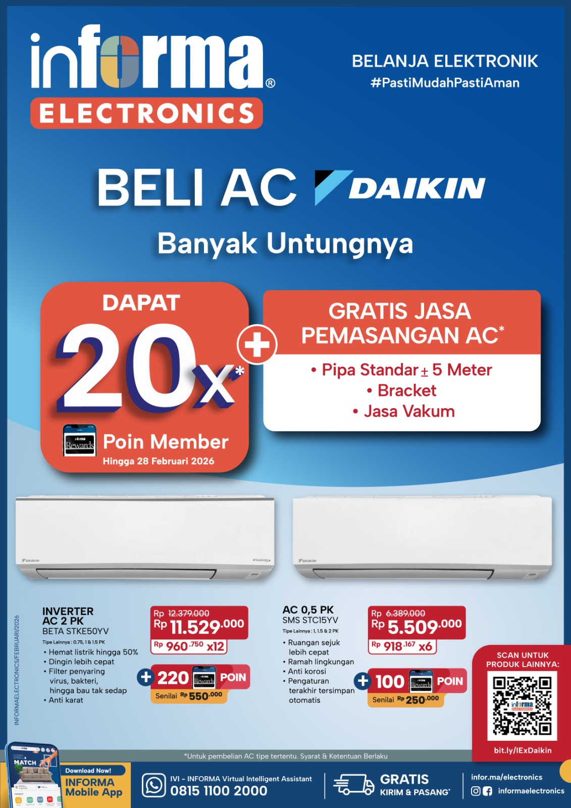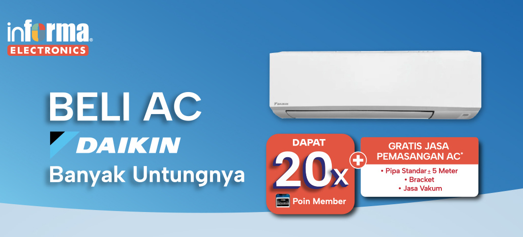 Dapatkan 20x poin member INFORMA Rewards setiap beli AC Daikin di INFORMA Electronics, dan pakai lagi poinnya buat belanja kebutuhan rumah lainnya.