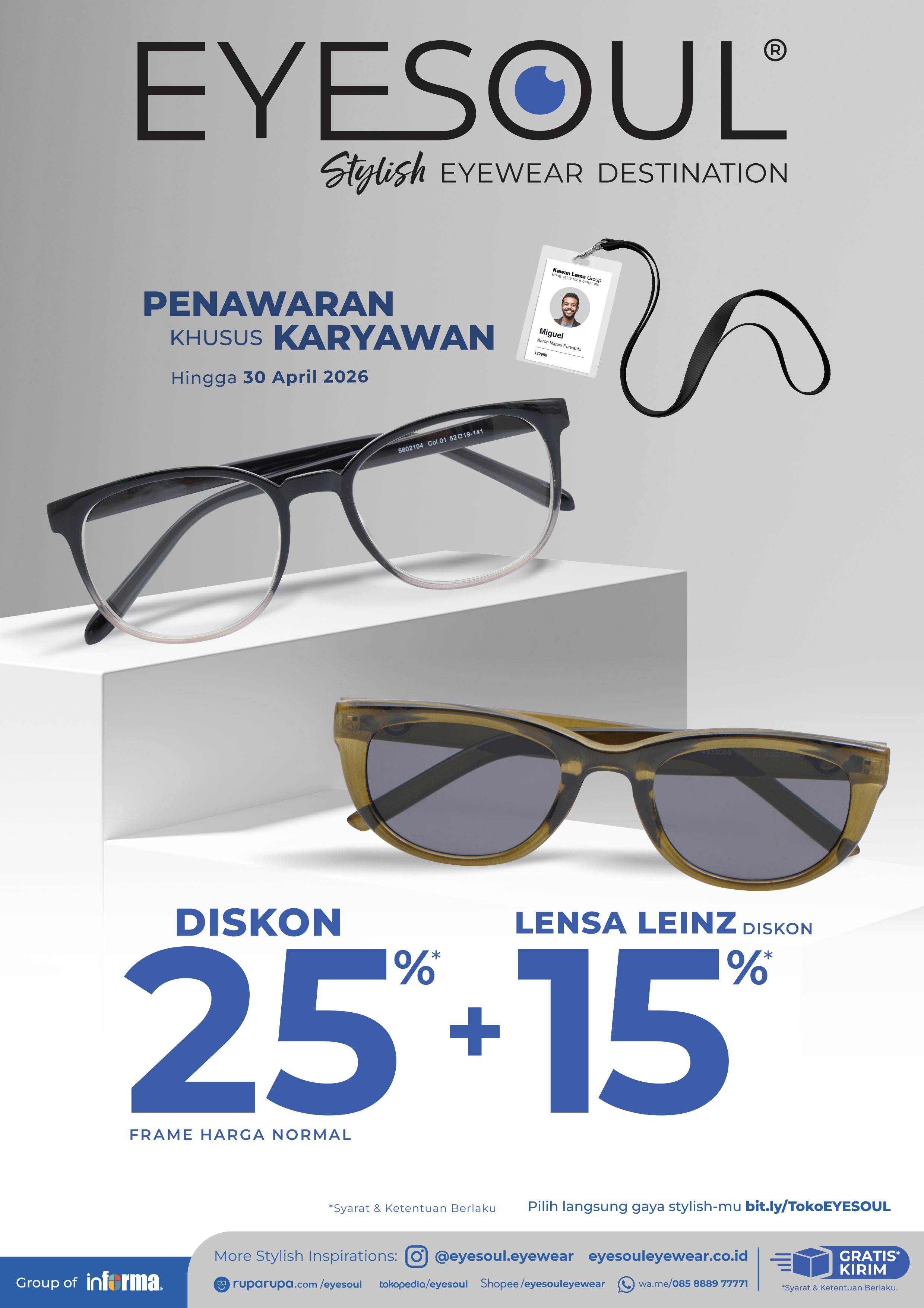 Spesial buat Insan Elite, EYE SOUL kasi penawaran double diskon buat belanja kacamata :