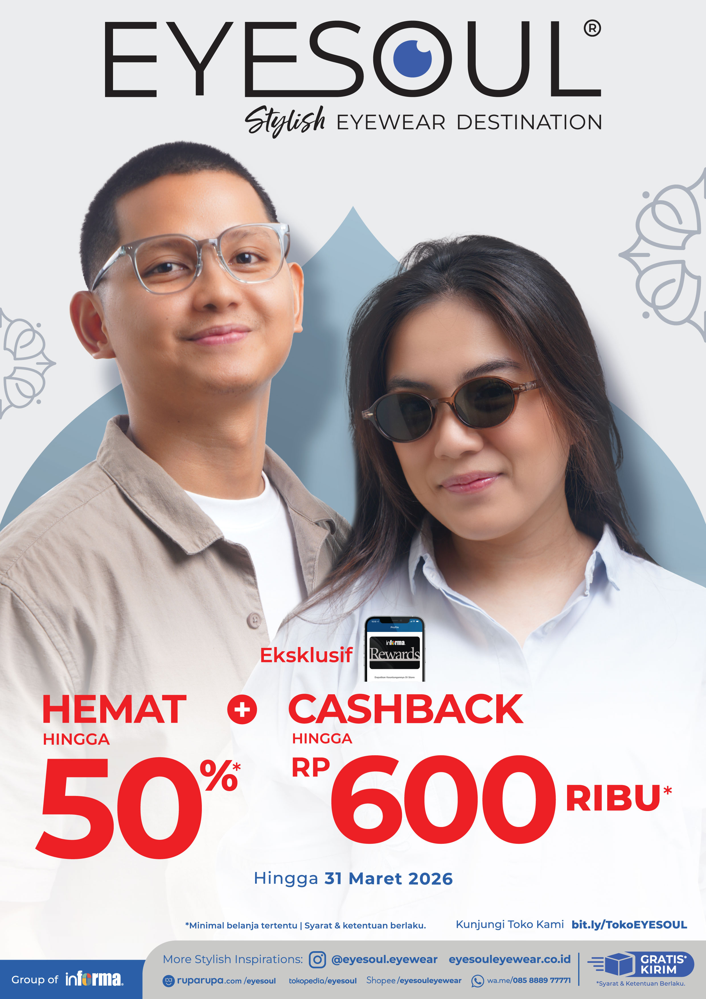 Pilihan kacamatanya lagi hemat hingga 50%* + dapat cashback hingga Rp 600 Ribu* spesial Member INFORMA Rewards.