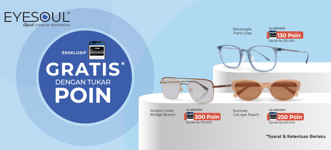 Mulai 130 poin aja, kamu udah bisa bawa pulang kacamata EYE SOUL, gratis! Ada yang optical, magnetic, sampai sunnies untuk anak & dewasa.